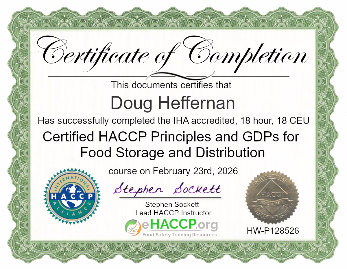 The Certified HACCP Principles and GDPs for Food Storage and Distribution Course and Certified HACCP Principles and GMPs for Restaurant and RTE Industries courses are comprehensive, self-paced training programs designed for professionals responsible for developing and managing HACCP-based food safety plans. Participants gain the knowledge and practical skills required to conduct hazard analyses, determine critical control points, establish monitoring procedures, and implement verification and corrective action programs.